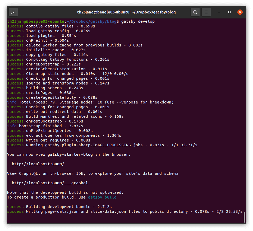 gatsby develop를 이용하여 localhost에서 확인할 수 있다.