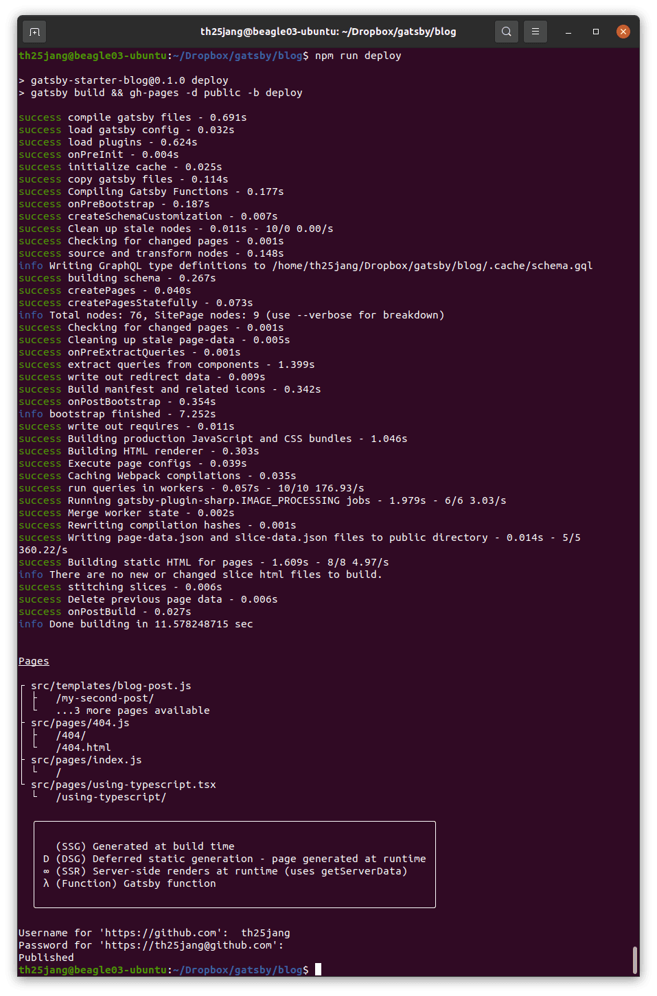 npm run deploy설치 내용은 gatsby-cli 설치 후 "blog" 디렉토리에 gatsby-starter-blog 테마 파일을 생성한 후 이를 github에 upload하는 내용이다. upload시 id와 pwd를 입력해야 하는데, pwd가 사용자암호가 아니라 github에서 생성한 키를 입력 것이어서 과정이 조금 길어졌다.